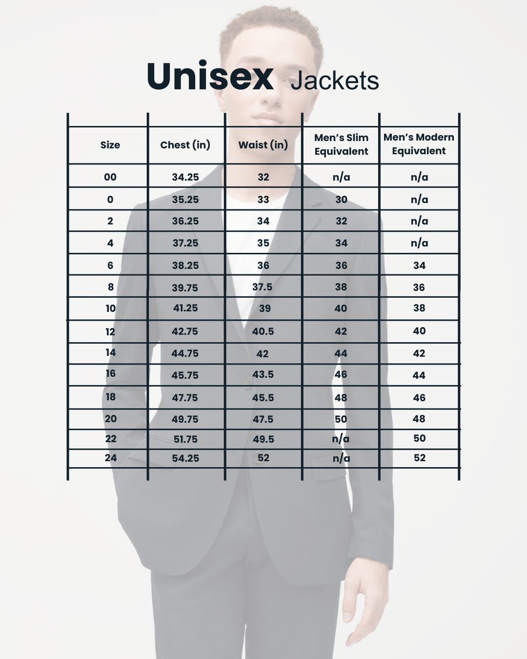 Size charts can be found here for men's, women's, unisex, and kids suits, jackets, pants, vests, shirts, and belts.